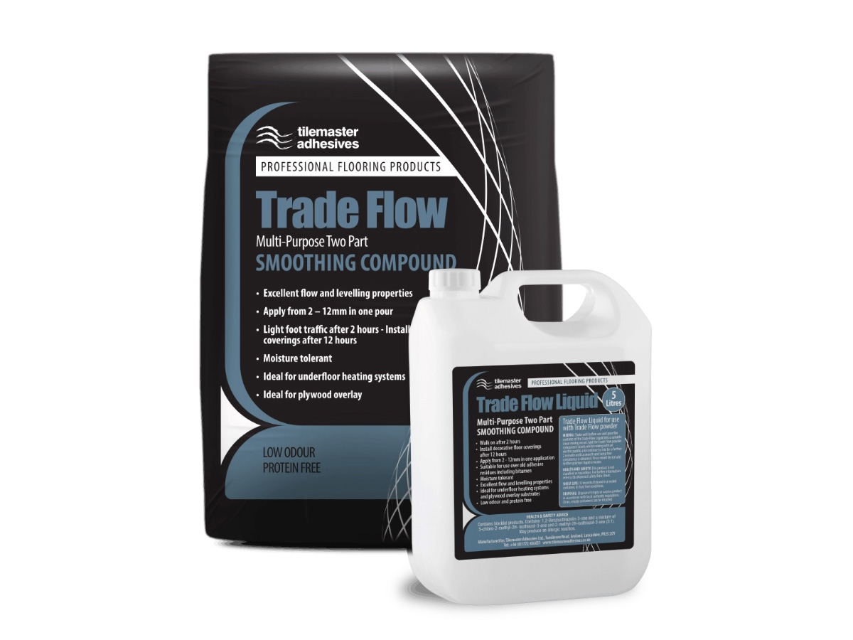 Tilemaster Trade Flow is a multi-purpose, double component smoothing and levelling floor compound. The specially formulated powder component is mixed with a pre-gauged, protein free polymer liquid, giving a free-flowing, shrinkage compensated floor compound that can be applied from depths of 2mm – 12mm in one application.