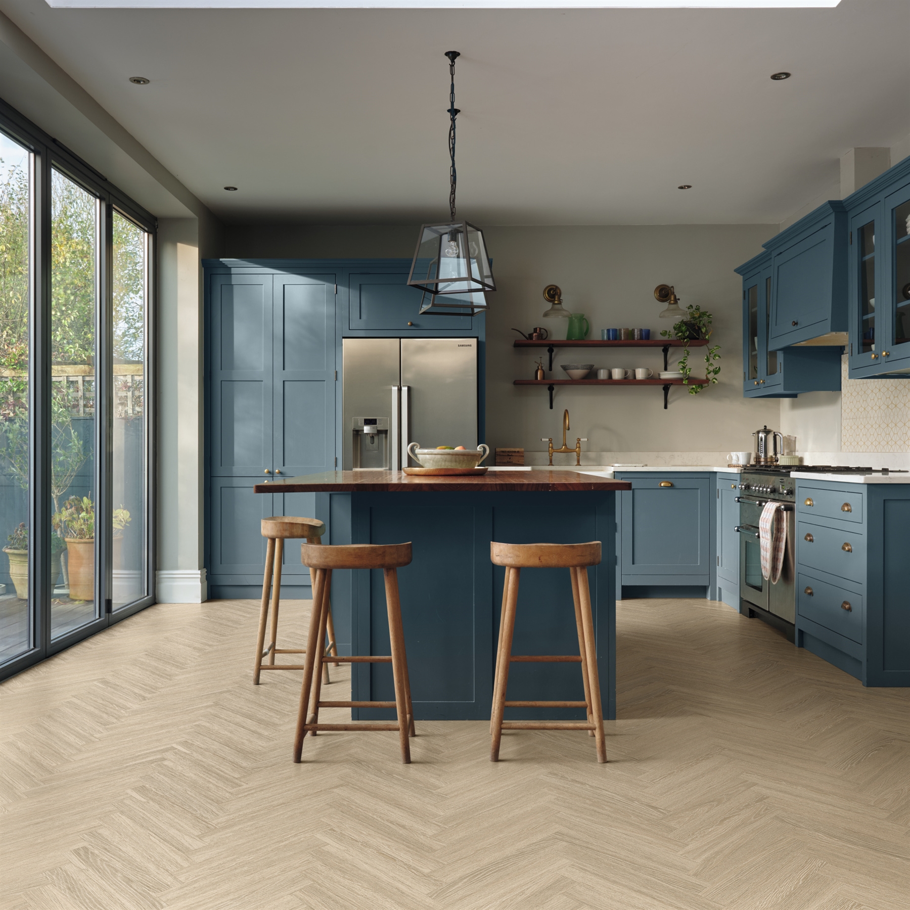 Elevate your home with the subtle elegance of Dolce Prime Herringbone from Palio Essenza by Karndean. With its pale oak tones and classic herringbone layout, this flooring brings a light, spacious feel and a touch of traditional charm to any room.