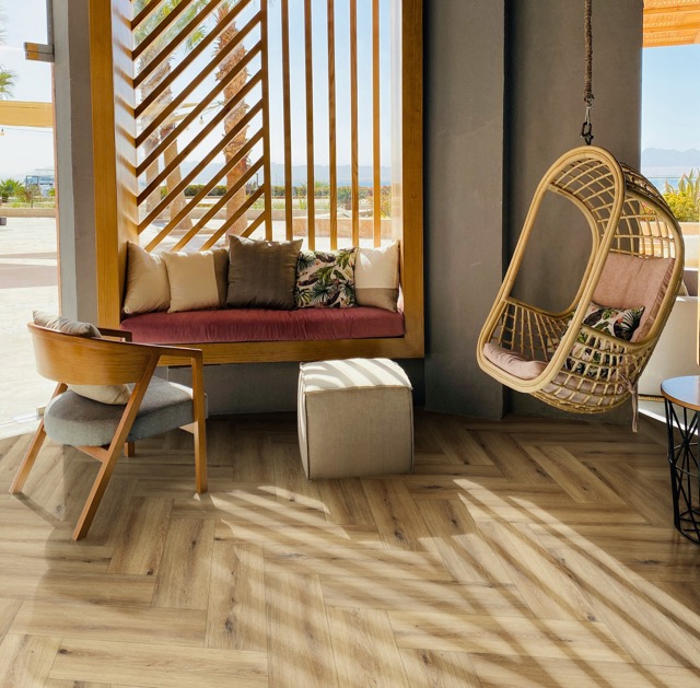 The White Oak finish is defined by its soft neutral palette and subtle woodgrain texture—perfect for brightening up spaces and creating a calm, refined atmosphere. The herringbone format adds visual interest and a high-end designer feel, making it a standout choice for both residential and commercial settings.