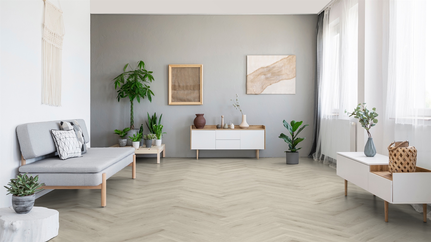 Introduce timeless elegance with a modern edge using Lamett Mantaro Herringbone Glue Down LVT in Fossil (5611). This refined herringbone design features a cool, grey-toned wood effect that brings a sophisticated and contemporary feel to any interior. The subtle grain detail and matte finish add depth and texture without overpowering the space.